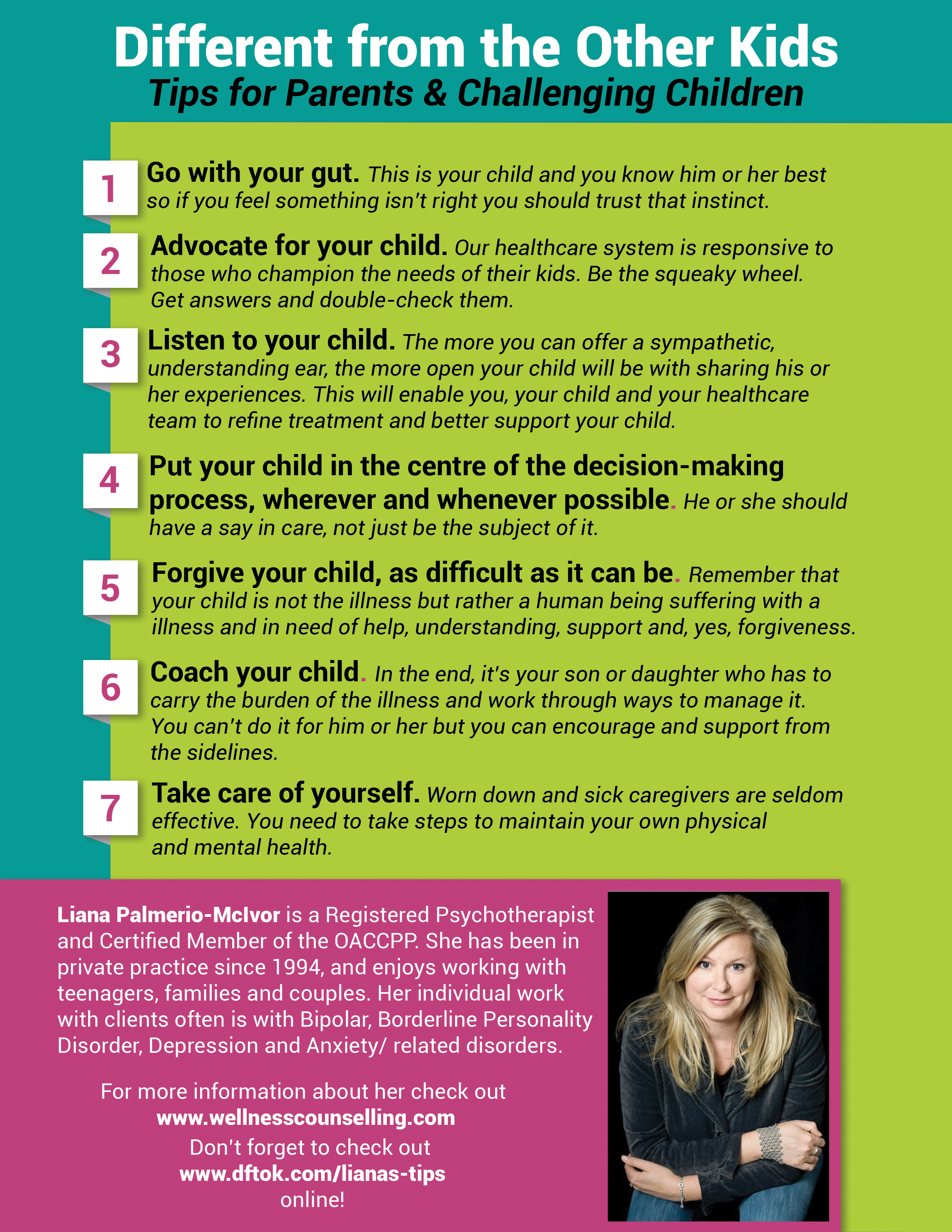 We’ve got a collection of tips for parents of challenging children from a registered psychotherapist, Liana Palmerio-McIvor, who spoke with Angela in chapters 12 & 13 of Different from the Other Kids: A Book of Interviews for Parents of Challenging Children.