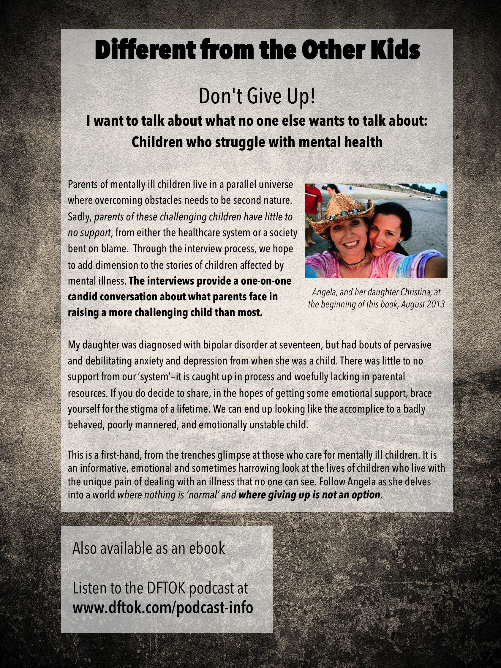 Welcome to Different from the Other Kids – A Community of Shared Experience for Parents of Challenging Children. Please browse our website for more information about our creator, our mission, our podcast or our book.